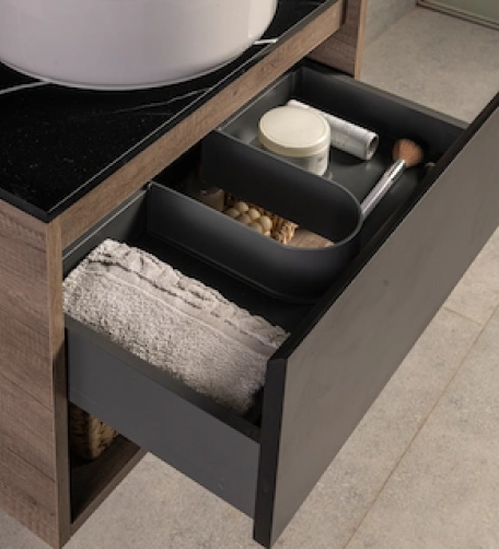 - Una percepción y consejo que damos desde Zedra: Siempre hemos considerado que la altura ideal de un mueble de baño debe estar ligeramente por encima de la cintura para evitar inclinar demasiado la espalda. En nuestro caso, preferimos los vanitorys suspendidos, ya que se pueden ajustar según la necesidad del usuario.