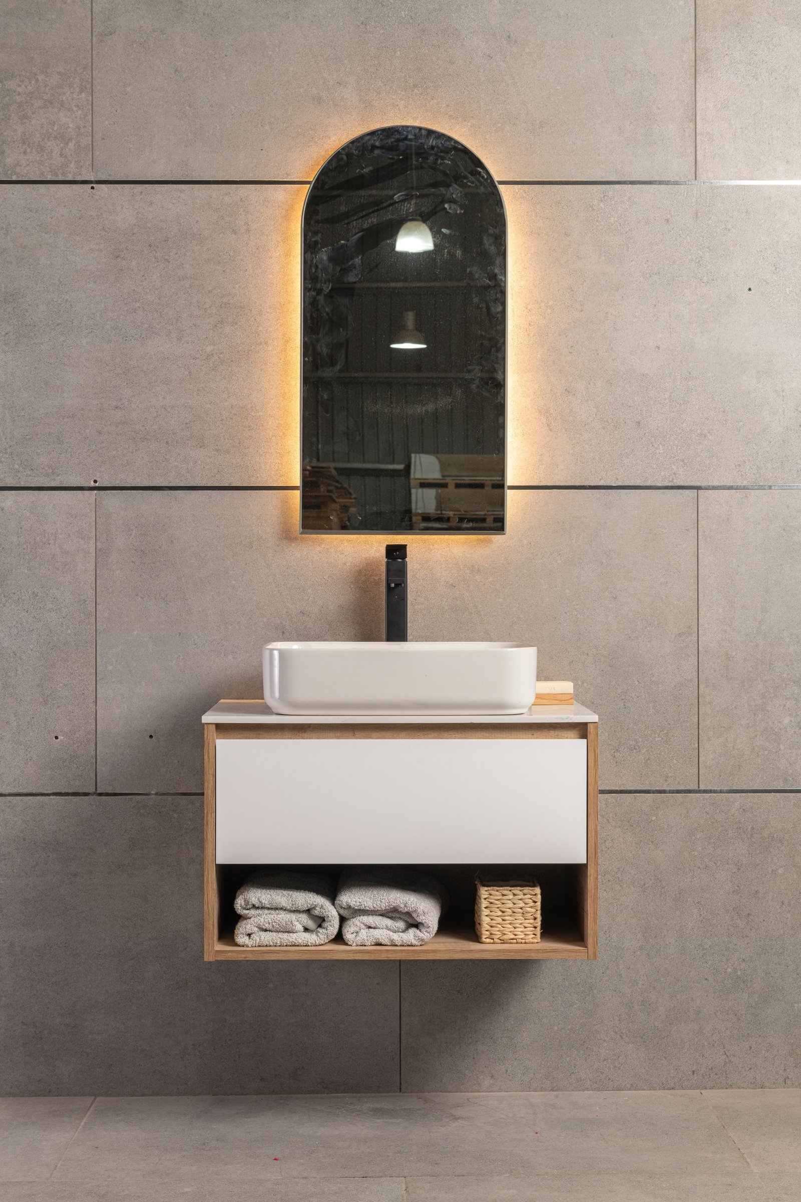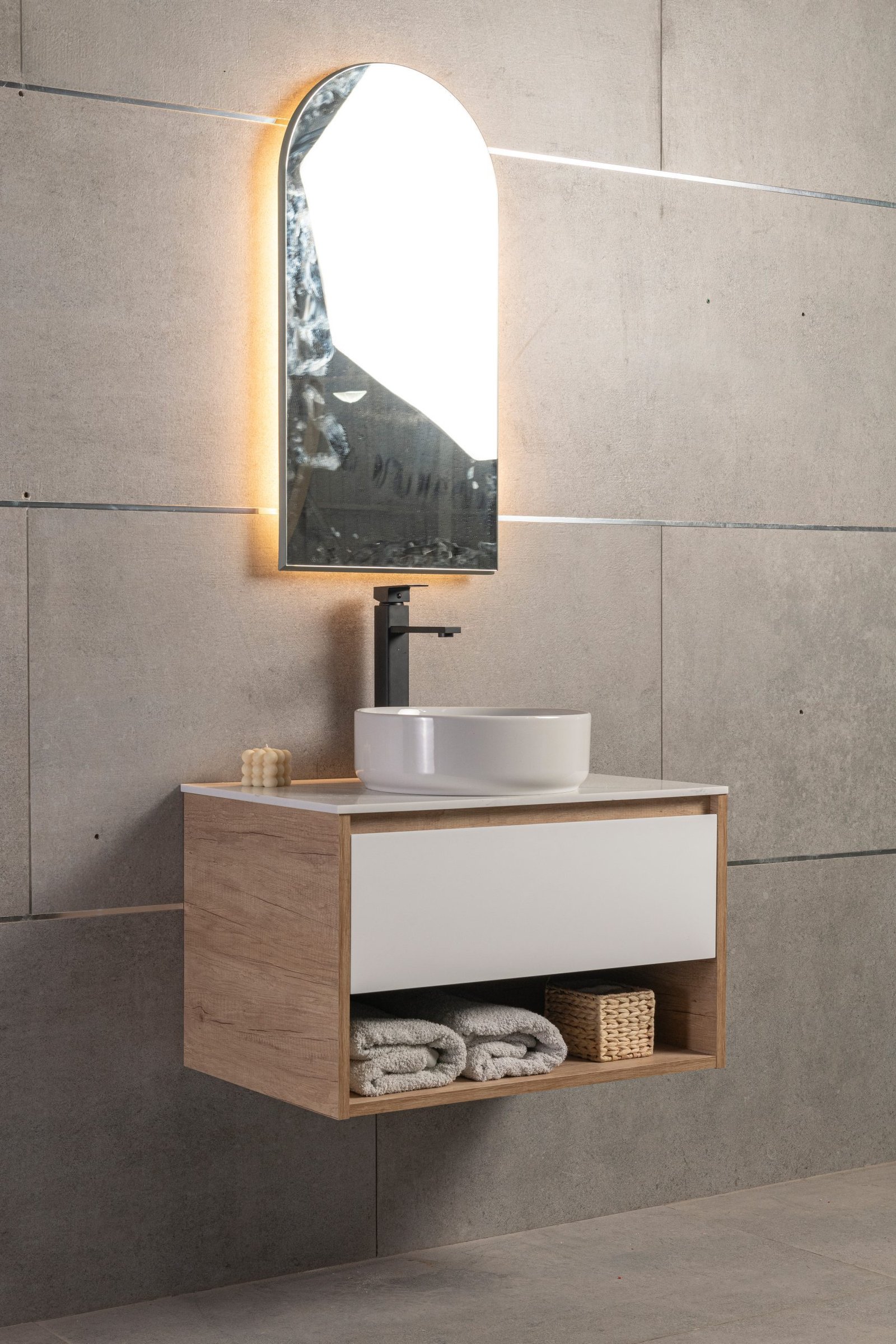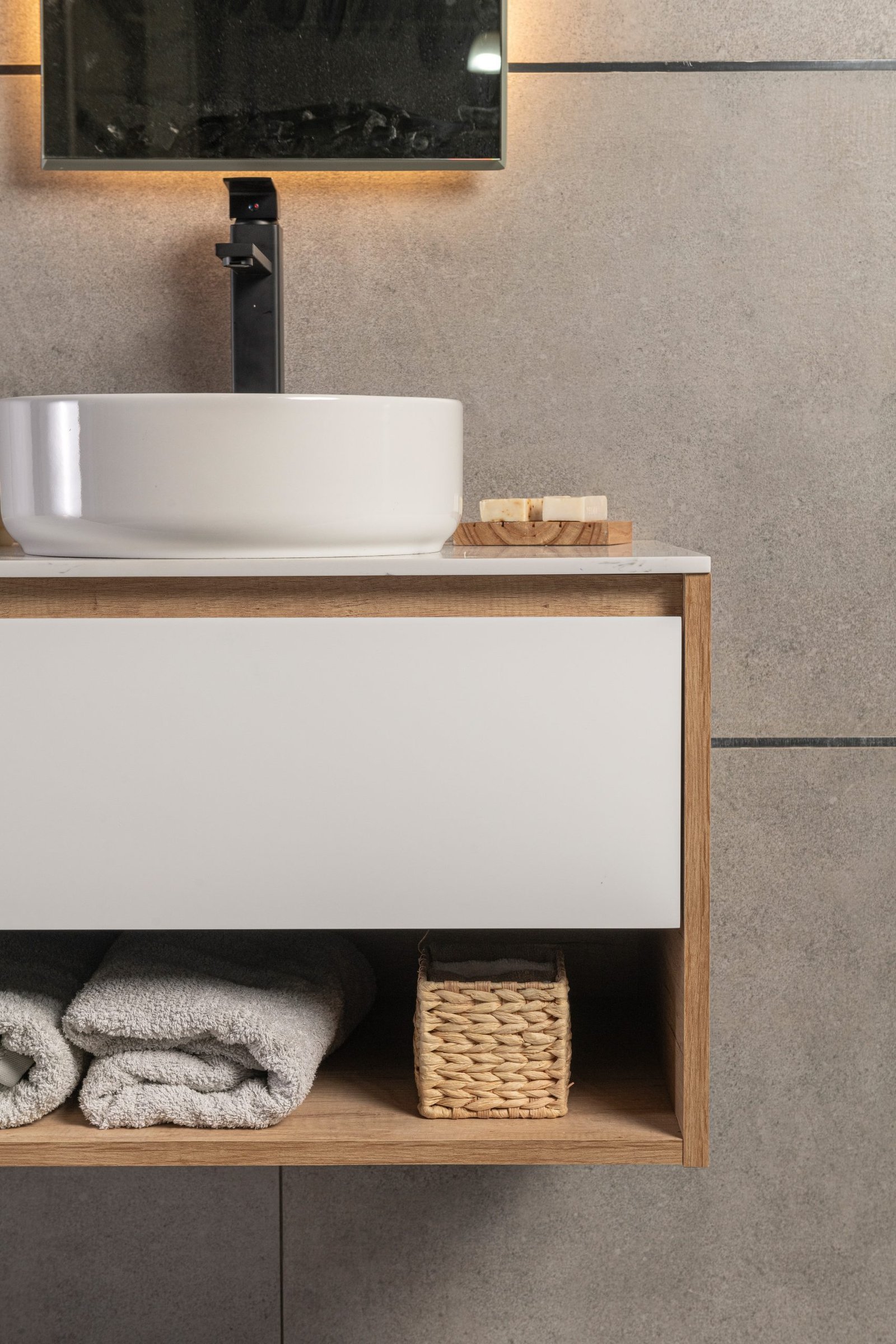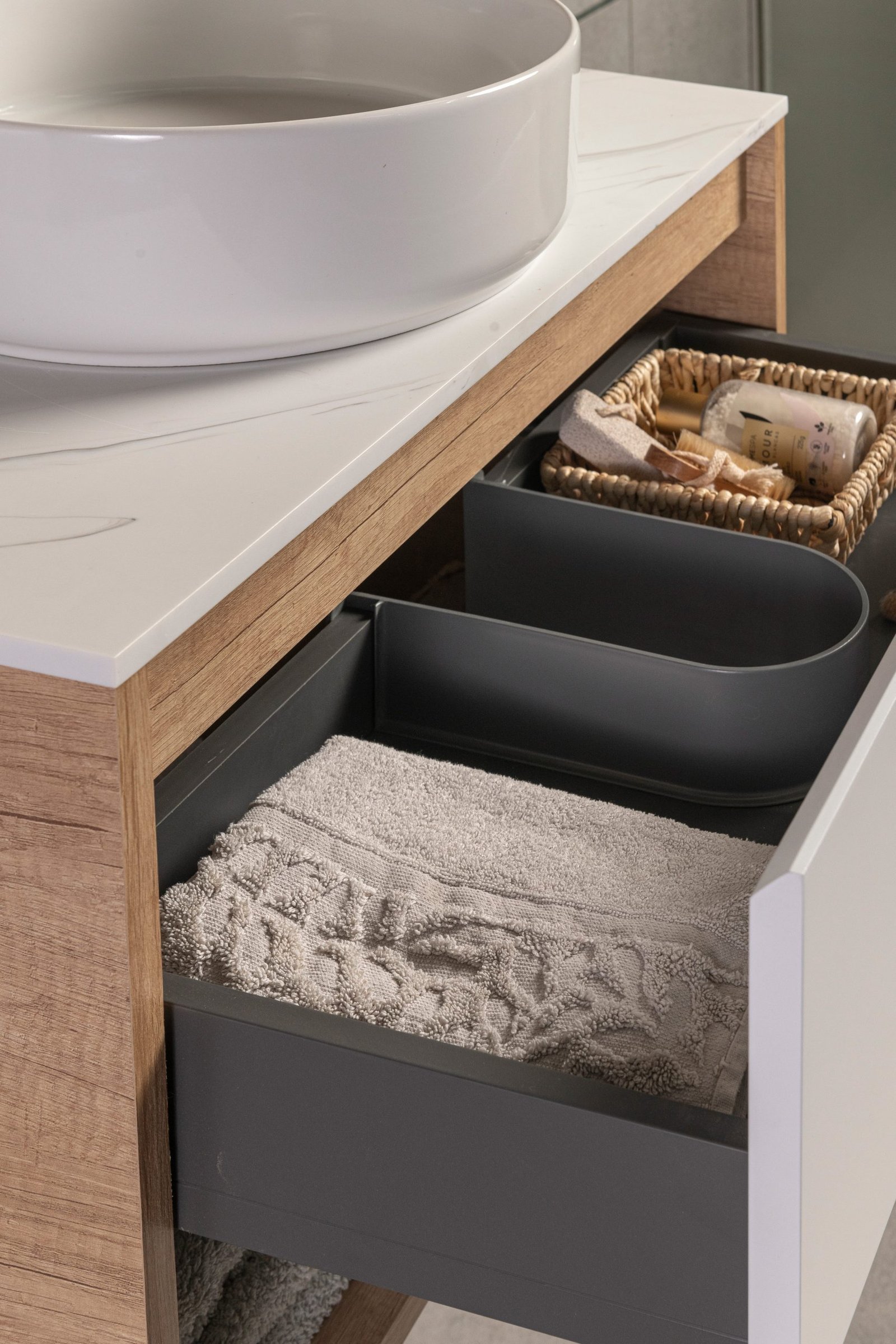 Modelo flotante con cajón y nicho, ideal para maximizar el espacio en baños modernos.